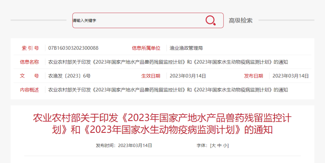 資訊 | 農(nóng)業(yè)農(nóng)村部發(fā)布《2023年國(guó)家產(chǎn)地水產(chǎn)品獸藥殘留監(jiān)控計(jì)劃》